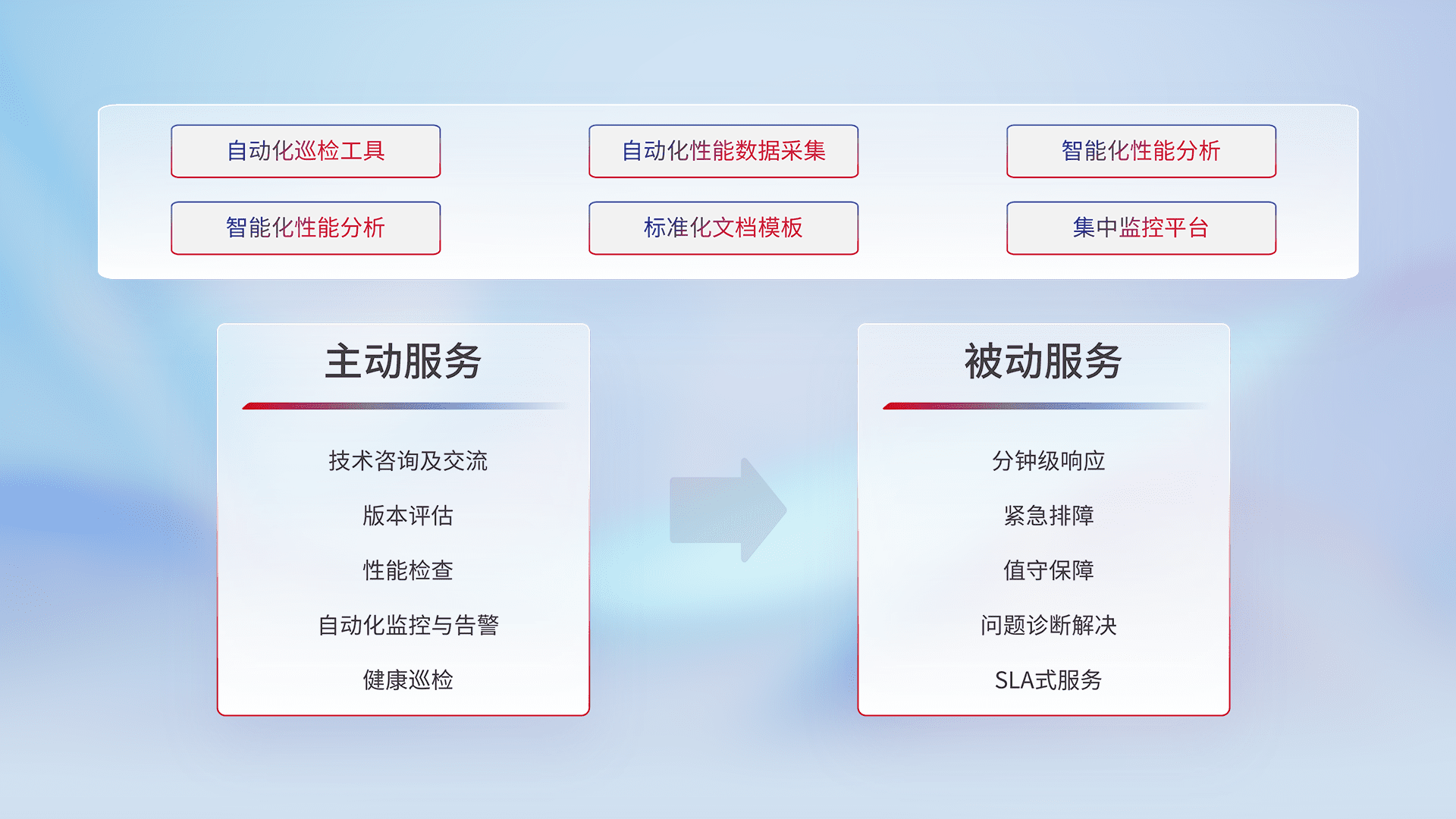 智能化工具和标准化文档,,,,保障服务质量,,,,提供主动服务(包含技术咨询、、版本评估、、性能检查、、、自动化监控与告警、、健康巡检)和被动服务包含(分钟级响应、、紧急排障、、、、值守保障、、问题诊断解决、、、、SLA服务)。。。