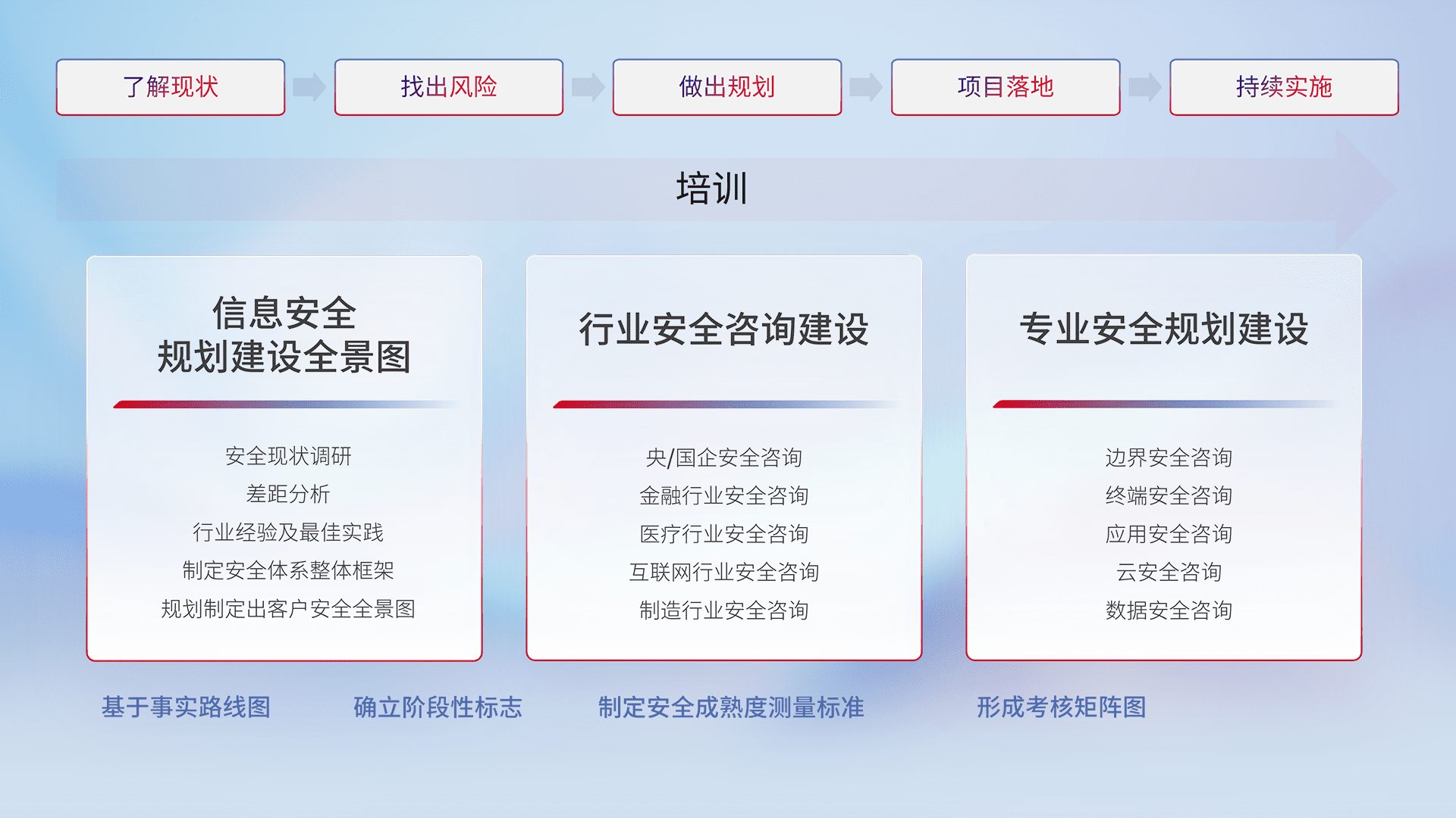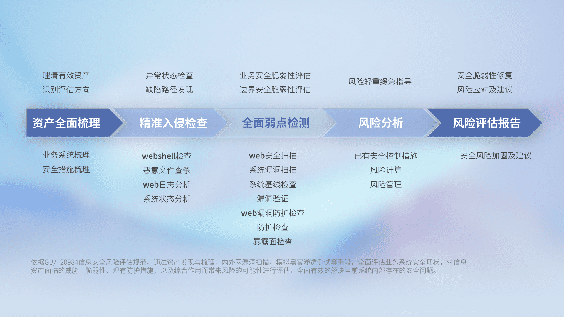 针对客户行业特性,,,,以专业的安全服务+多厂商联合解决方案提供专属的一站式安全管理服务,,帮助客户全面感知网络空间威胁,,基于识别、、检测、、、、分析、、防护、、、监测、、、、响应的服务理论模型,,从方案咨询、、集成交付、、、评估验证、、、、优化加固、、、、运维运营,,,致力于为客户提供完整的闭环管理式安全服务。。以实战经验为客户打造高抵御风险的安全体系,,,帮助客户发现威胁、、、、对抗威胁、、、处置威胁,,,不断积累安全对抗能力,,,,持续保障数字化安全。。