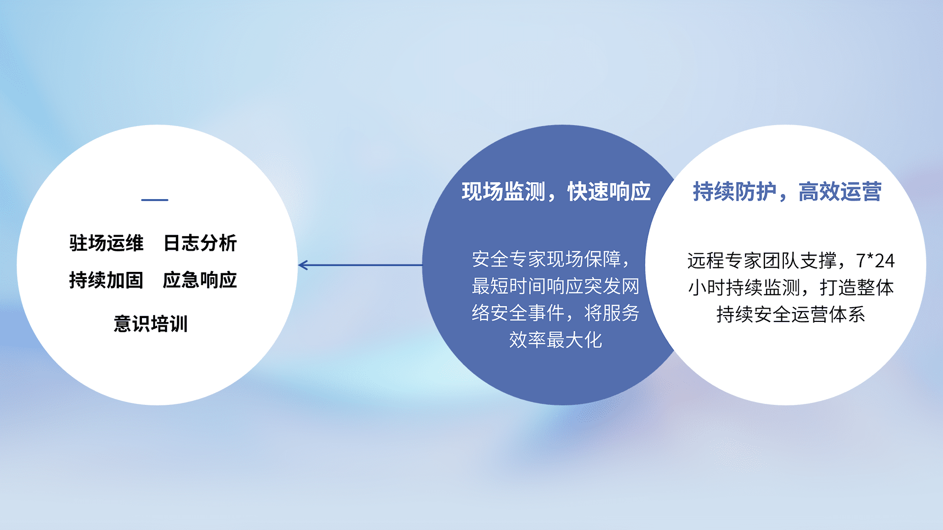 针对客户行业特性,,,,提供专属的一站式安全管理服务,,,,帮助客户全面感知网络空间威胁,,,通过安全专家的线上、、、线下防护支持,,,,实现风险闭环,,,,将安全保障常态化,,,,为客户打造常态化安全运维运营服务。。。